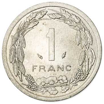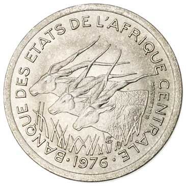 The three Giant Elands shown here appear on several different coins from the Central African region. In this case, the coin was issued by the Bank of Central African States on behalf of all its members.