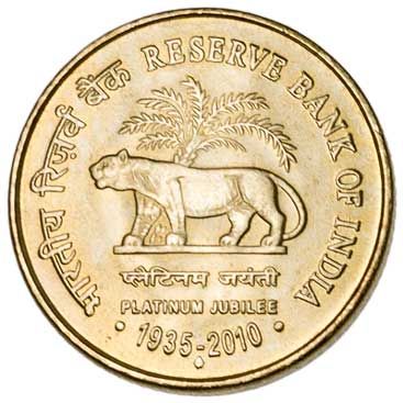 This circulating coin was issued in 2010 to commemorate the 75th anniversary of the Reserve Bank of India.