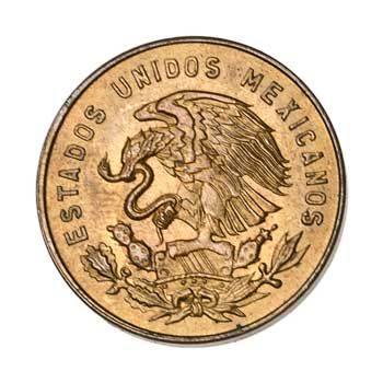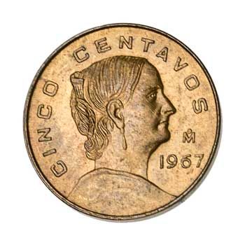 This coin appeared from 1954 to 1969. Once again, the 5 centavo coin changes in size in metal. The same coin was minted in copper-nickel (KM426a) in 1960, 1962, and 1965. The copper-nickel version is rare and can be worth hundreds of dollars.