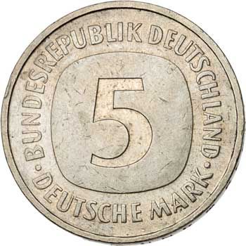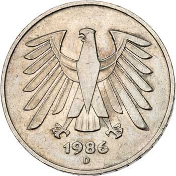 One of only two circulating 5 Deutsche Mark coins, this second one was minted in copper-nickel from 1975 through to 2001 when Germany switched to the Euro. Although the Bundesadler here is stylized, it is less so than the highly stylized eagle that appeared on the previous silver 5 Deutsche Mark coin.