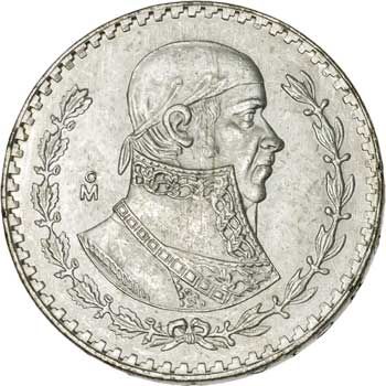 This large sort-of-silver peso was issued from 1957 to 1967. With only 10% silver content, Mexico did not bother displaying the silver content on the coin as they usually did.