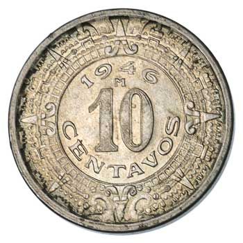 After switching to a large bronze 10-centavos coin in 1919, returning to a silver piece in 1925, then resuming the bronze issue in 1935, Mexico split the difference in size with this copper-nickel coin in 1936. This issue lasted for 10 years.