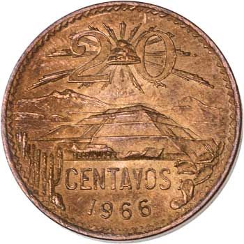 Between 1905 and 1984, Mexico issued nine different 20-centavos coins, including three large bronze issues that are very similar in design. This is the second of the three bronze coins.