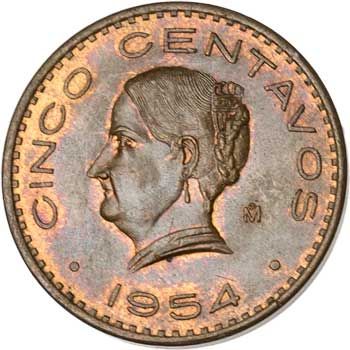 This coin appeared from 1942 to 1955. Its earlier incarnation (KM425, 1936-1942) marked the first appearance of the eagle in profile. For some reason, Mexico's coins grow and shrink repeatedly. This is the second largest 5-centavo coin.