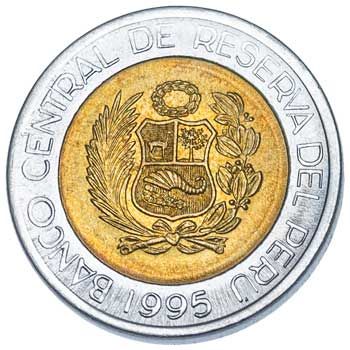 This first 5 neuvos-soles coin features the Nazca lines condor geoglyph. It was minted from 1994-2009.