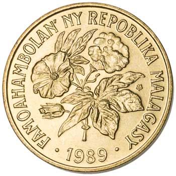 "Ariary Efatra" on the reverse is the denomination, one of only a few non-decimal denominations in the world. It is equivalent to 20 Francs. The ariary became the official currency of Madagascar on January 1, 2005.