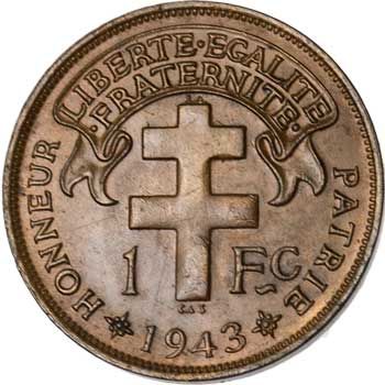 The Gallic Rooster appeared one year only (1943) on the French colony of Madagascar's 50-centime and 1-franc coins. The reverse features the Cross of Lorraine, originally the symbol of Joan of Arc, and adopted by the Free French Forces during World War II.
