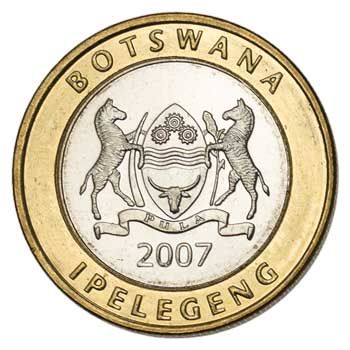 The Mopani (Gonimbrasia belina) is a moth found in large parts of Southern Africa. But before it metamorphs into a moth, it is a big fat worm known as the Mopane worm (Mashonja or Phane in Botswana) and it is an important source of protein for millions of indigenous Africans. They eat a variety of vegetation, including the Mopane tree, which is what the little critter on this coin is fattening up on.