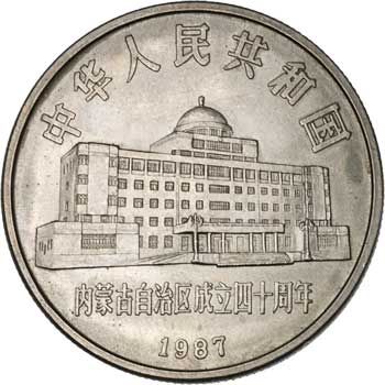 This circulating commemorative coin was issued in 1987 to mark the 40th anniversary of the Inner Mongolian Autonomous Region.