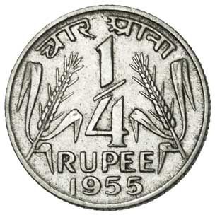 This quarter rupee coin was minted from 1950 to 1956.