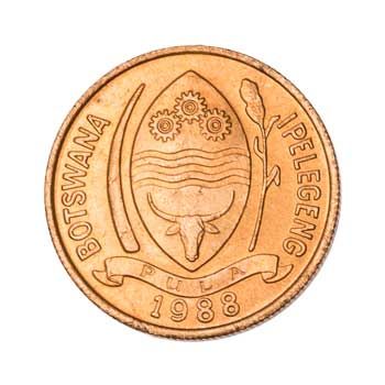 It seems very likely that this is a Red-billed Hornbill. There are about six hornbill species resident in Botswana and the Red-billed Hornbill most closely resembles our friend on the 5-thebe coin. I had previously thought this was a Southern Yellow-billed Hornbill, but it was pointed out to me that the tail more closely matches the pattern of the Red-billed species. Also, it seems the Yellow has a thicker beak (it is known as the 'flying banana'), and the Red has a slightly thinner beak as depicted on the coin.