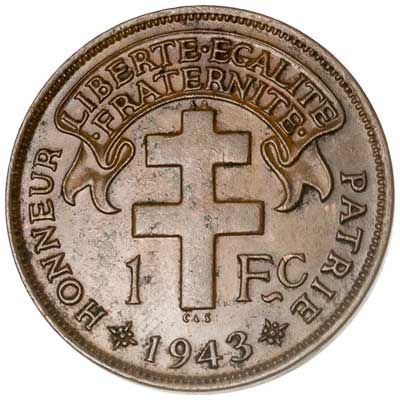 This splendid Gallic Rooster appeared one year only (1943) on this Cameroon 1-franc coin. Later that year, the design was changed slightly with "Libre" being added to the legend (KM7). The reverse features the Cross of Lorraine, originally the symbol of Joan of Arc, and adopted by the Free French Forces during WWII.