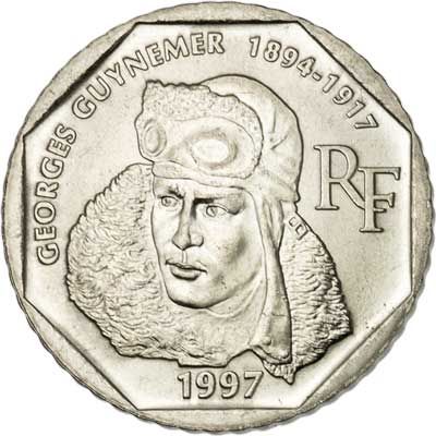 The obverse of this coin portrays Georges Guynemer, a top fighter ace for France during World War II. He flew with the "Storks" squadron, and the stork depicted on the reverse was a symbol of that squadron. It appeared on Guynemer's original biplane.