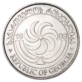 Georgia's first coinage as an independent state after the fall of the USSR reflects the country's 3,000 year history. This 2-thetri coin depicts a peacock with wings spread (but no fanned tail). The peacock is an ancient symbol representing Christ and the resurrection. Christianity in Georgia traces back to 317 CE, when the Georgian Kingdom of Colchis became one of the first nations in the region to adopt the new religion.