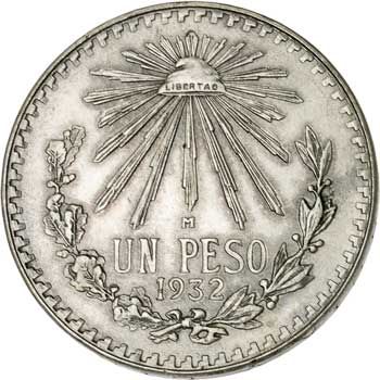This large silver peso was issued from 1920 to 1945. As with all Mexican silver coins, it has the purity of the silver (0.720) engraved on the obverse of the coin. At 16.7 grams, that means this coin contains 0.3856 ounces of silver.