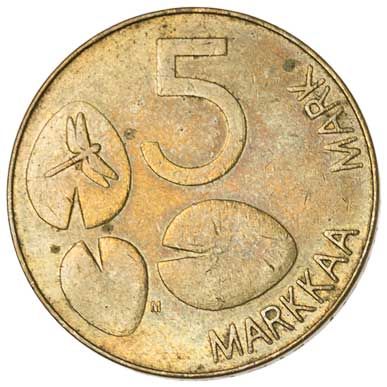 In 1963, Finland underwent monetary reform, with 100 old markkaa worth one new markkaa. This 5-markkaa coin was issued from 1992 to 2001, when Finland switched to the euro.