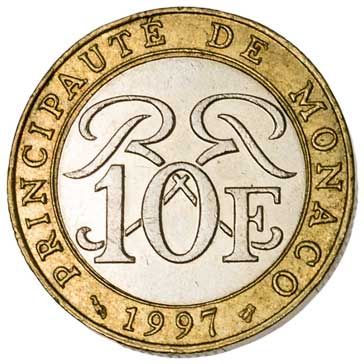 In 1960 Monaco underwent monetary reform, replacing 100 old francs with 1 new franc. This bi-metallic 10 franc coin is the only circulating coin during this period with a knight on horseback. It was issued from 1989 until 2000. (Monaco switched to the Euro in 2002.)
