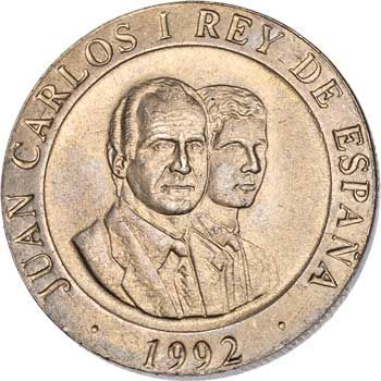 This circulating commemorative coin was issued in 1992 to commemorate Madrid as a capital of European culture. The image on the reverse is the Madrid monument "Portadores de la antorcha" (Torch bearers).