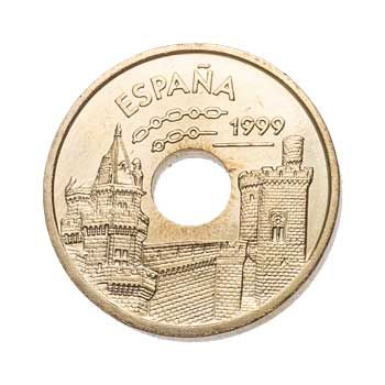 This circulating commemorative coin was issued in 1999 as part of the "Autonomous Communities of Spain" series. The reverse features a man running for his life from a bull during the feast of San Fermin in Navarre.
