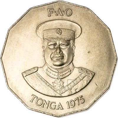 This FAO issue coin features 49 fish swimming in five concentric circles, with one arching fish in the centre. The reverse legend 'Fakalahi me'akai' is Tongan for 'Grow more food'.