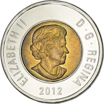 In 2012, Canada changed the two dollar coin to include several security features, including edge lettering ("CANADA 2 DOLLARS"), and on the reverse the two maple leafs on either side of the 2, and the two sort-of-hidden maple leafs in the lines at the top.