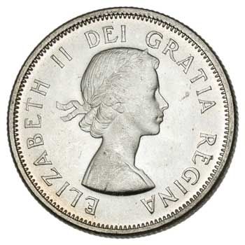 Silver versions of this coin (same caribou design, with different obverses) are KM35 (George VI), KM44 (George VI with changed legend), KM52 (this example), KM62 (QEII second portrait), and KM62a (1968, silver downgraded to 0.5000).