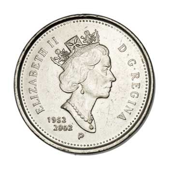 This example celebrates the golden jubilee of Queen Elizabeth, who still appears all over Canadian money for some reason. The date was moved from the reverse to the obverse.