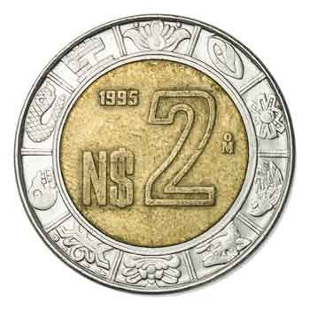Mexico underwent monetary reform in 1992, with one new peso equal to 1,000 old pesos. This new two peso coin is denominated as "N$ 2" (N for "new").