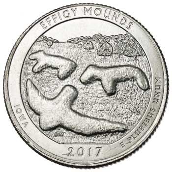 Iowa's coin features Effigy Mounds National Monument. Dating back to between the early 7th and mid 13th century, the meaning/purpose of the mounds is mostly lost in time. Twenty different present-day Native American tribes are culturally associated with the Effigy Mound builders of the past.
