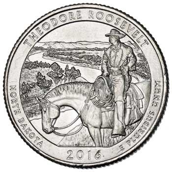 North Dakota's coin features Theodore Roosevelt National Park in North Dakota. with Teddy himself riding a horse in search of a bear to wrestle. Probably.
