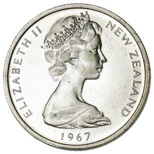 New Zealand switched to decimal coinage in 1967, and this is the first 5-cent coin issued. The last circulation 5-cent coin was minted in 2004, but most of them were melted. In 2005, New Zealand removed 1-, 2-, and 5-cent coins from circulation.