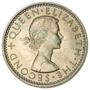 The original Huia 6-pence was minted 1933-1936. This copper-nickel version was minted from 1953 to 1965.