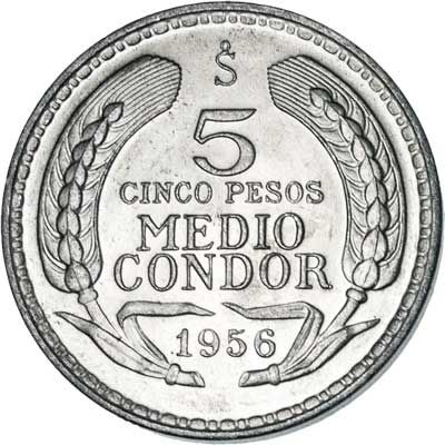 Chile's "old peso" lasted from 1817 to 1959. The condor took several forms during this period, but the 5- and 10-peso (½ and 1 condor) coins of 1956 are the first time the bird takes flight. This 5-peso (½-condor) coin was minted in 1956 only.