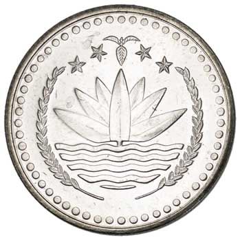 The obverse shows the national emblem of Bangladesh, featuring a water lily bordered by rice sheaves, with tea leaves above.