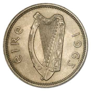 The shilling features a bull. Cows and the breeding of cattle was very important in Ireland's early agricultural economy. This design appeared on the first coinage of the Irish Free State in 1928 (KM6), and was struck in silver. The bull design was continued with a modified obverse in 1939 (KM14) and this issue in copper-nickel was struck from 1951 to 1968.