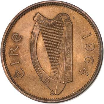 The half-penny features a sow and her piglets. When this coin was issued, most families in rural Ireland kept at least one pig that was fed kitchen refuse and other vegetable and animal scraps. This design appeared on the first coinage of the Irish Free State in 1928 (KM2), and was carried over with a modified obverse on this issue from 1939 to 1967.