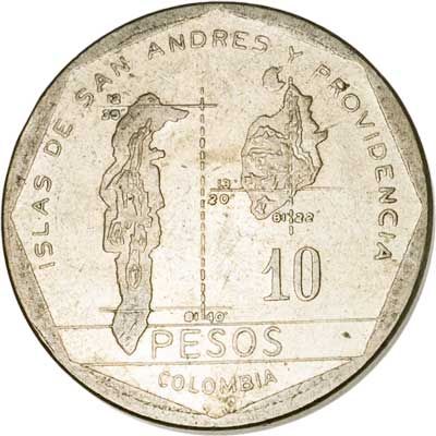 On the reverse, we have 'Islas De San Andres Y Providencia', which is the archipelago of San Andes, also a department of Colombia.